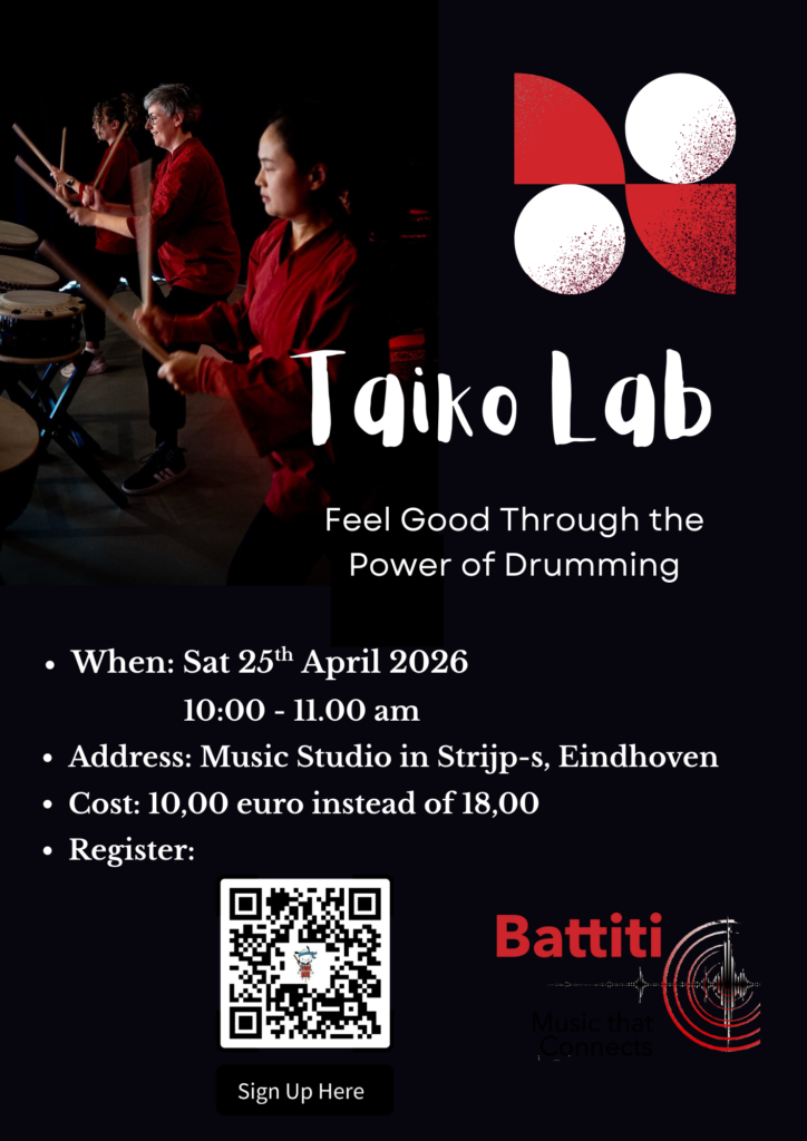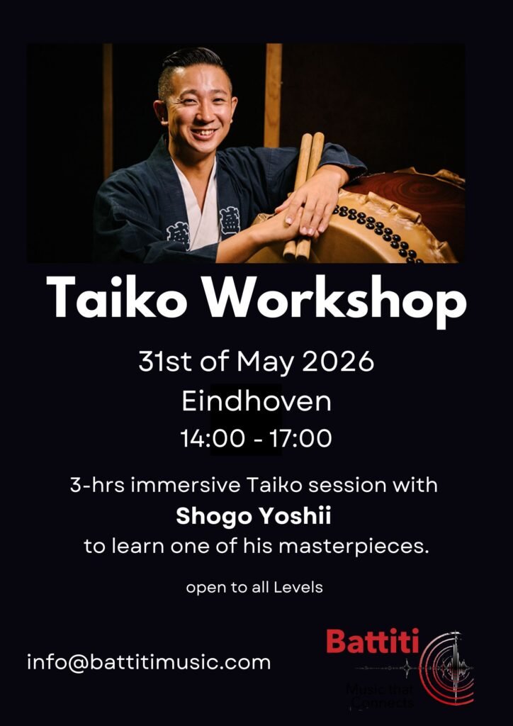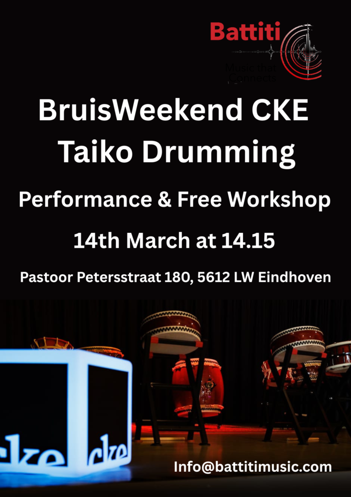 Workshops, Classes, Events Battiti – Upcoming EventsExperience the energy of Taiko drumming and other percussion instruments in Eindhoven Learn More Register Here Register Here Pre-register August 7–8 –9 Taiko Performance + WorkshopEvent: Abunai! ConventionLocation: NH Conference Centre KoningshofProgram and timing: To be defined Learn More Calendar of Lessons Unlock in-depth lessons and extra practice material Click here to sign up